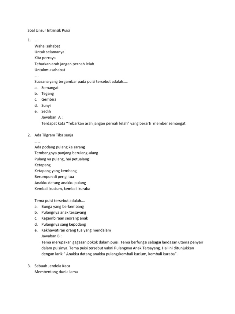 Kelas vii soal uraian puisi rakyat kelas 7 contoh soal puisi rakyat kelas 7 kurikulum 2013 soal pilihan ganda puisi rakyat kelas 7 beserta jawabannya soal puisi rakyat kelas 7 semester 2 soal puisi rakyat kelas 7 beserta jawabannya soal pilihan ganda. 60 contoh soal puisi pilihan ganda dan jawabannya contoh soal puisi pilihan ganda dan jawabannya. Unsur Intrinsik yang terdiri dari unsur batin tema rasa nada amanat dan unsur fisik diksi gaya bahasa rima amanat tipografi imaji kata konkret Unsur Ekstrinsik unsur biografi unsur sosial unsur nilai Soal 4.